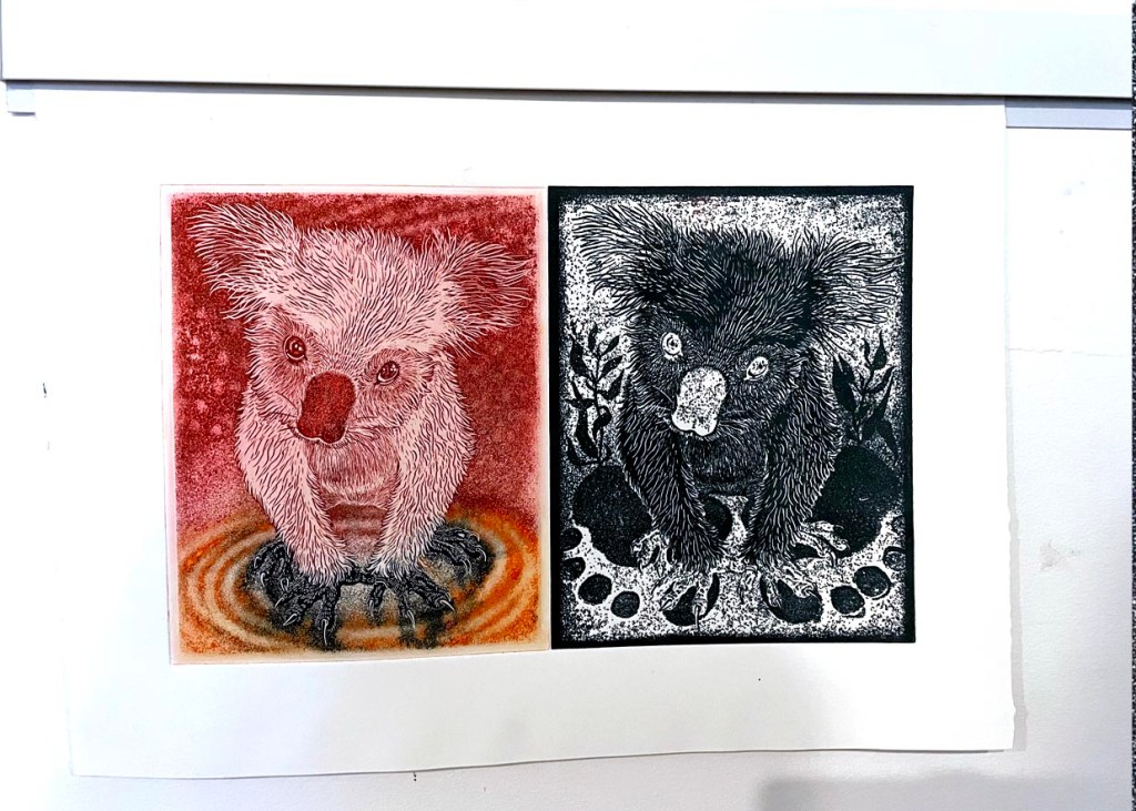 I have included, among others, artworks that highlight the plight of the Western Blue Groper and Queensland Hawksbill turtle, effected by climate change and over fishing in the Spencer Gulf in South Australia and the Great Barrier Reef. I explore the effects of climate change and subsequent fires and floods during 2019-20 on the NSW koala and flying fox populations. Tasmanian mask-faced owls and the Northern Territory’s Great Desert Skinks, effected by feral animals and invasive plants are also included. Drawings created from a recent visit to Kenya has also inspired images that explore the iconic Big Four animals who face ongoing survival challenges related to climate change in an unstable political landscape. The hand and feet of humans have left their traces across the landscape. My artworks are inspired by the beauty and wonder of these creatures combined with body prints representing the ever-present influence of humans that are both perpetrators and saviours.
