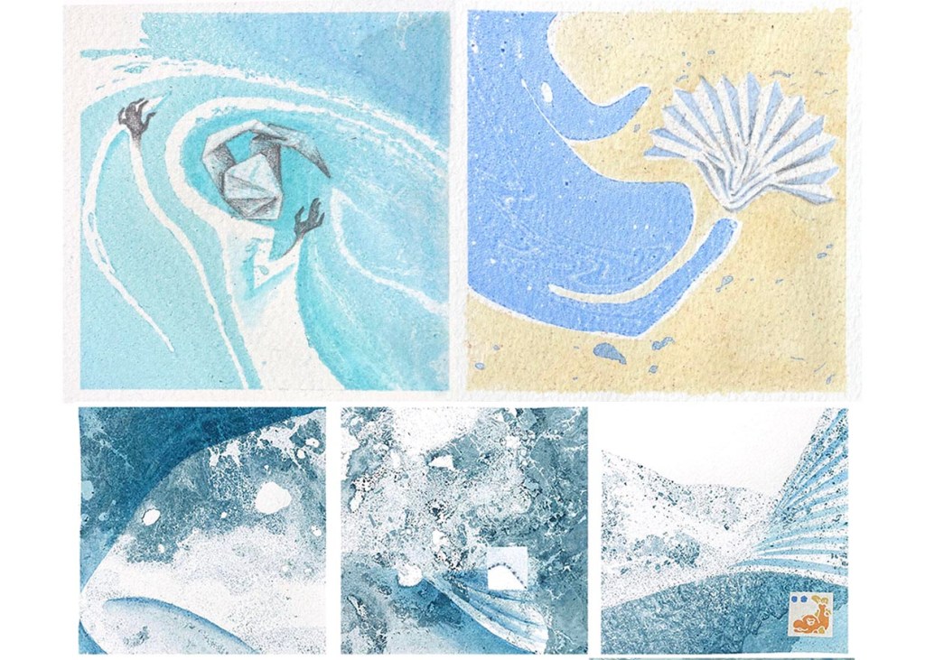 What do you see? (top left image). Did you see the rabbit? Or perhaps another animal or creature? Chances are you did not see a Kookaburra if you are not Australian. As part of my image-making practice I have been developing a form of ‘marbling’ using oil-based paint and turps on water. In my thesis Back to the drawing board? I refer to this form of accidental mark-making as ‘water squiggles’. The floating paint is transferred (lifted off the water’s surface on contact) using paper or canvas to create a single print (mono-print). Different chemical reactions are created by variations in the oil paint recipe, the quality of pigment used, the temperature of the water, and how long the paint is left on the surface. A wide variety of random patterns, textures, bubbles, splotches, and swirls are formed using this process. It is possible to direct the paint in certain directions by drawing into the surface with a stick or submerging the paper or canvas under the paint surface and allowing the paint to wash over.